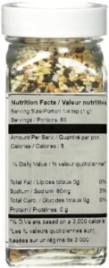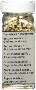 Sesame seeds / Graines de sésame Sea salt flakes / Flocons de sel de mer Dried minced garlic / Ail émincé séché Dried minced onion / Oignon émincé séché Black sesame seeds / Graines de sésame noir Poppy seeds / Graines de pavot